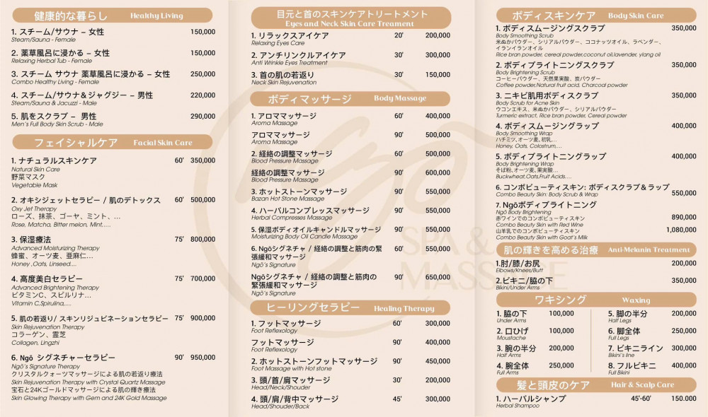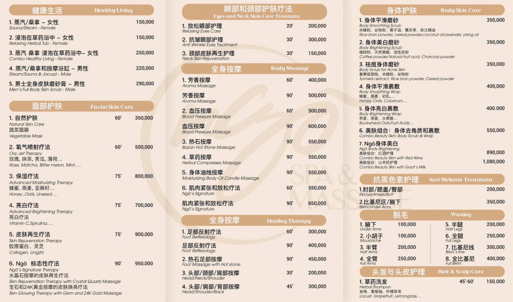 에센셜 오일 마사지, 페이셜 케어, 핫스톤 마사지, 발 마사지, 커플 마사지, 베트남 헤어 샴푸
