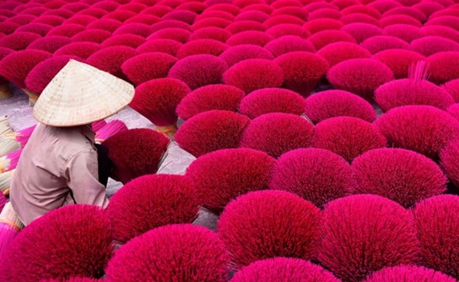 이 고대 마을에서 당신은 목격자가 될 뿐만 아니라 매력적인 공간에 푹 빠져들게 될 것입니다. 형형색색의 향 다발이 햇빛을 받아 화려한 그림으로 얽혀 있습니다. 심호흡을 해주세요. 묵직한 침향, 따뜻한 계피, 향긋한 아니스 등의 풍부한 향은 베트남의 고요한 마음과 영적인 의식의 독특한 향기입니다. 재료 선택, 블렌딩, 롤링, 건조까지 섬세하고 복잡한 과정을 배우게 됩니다. 매혹적인 풍경과 장인의 예술적인 작업 순간을 포착하려면 렌즈를 사용하는 것을 잊지 마세요. 2.
